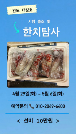 *** 완도 더킹호 예약 안내 ***예약문의 : 010-2049-6400오시는길 : 전남 완도군 완도읍 해변공원로124번길 6홈페이지 : https://thekingho.sunsang24.com/